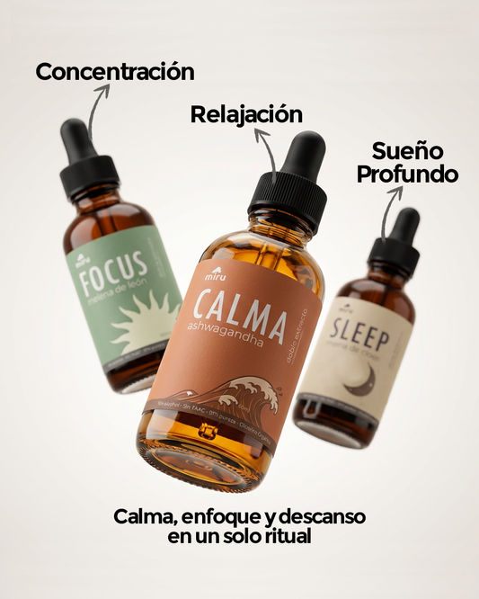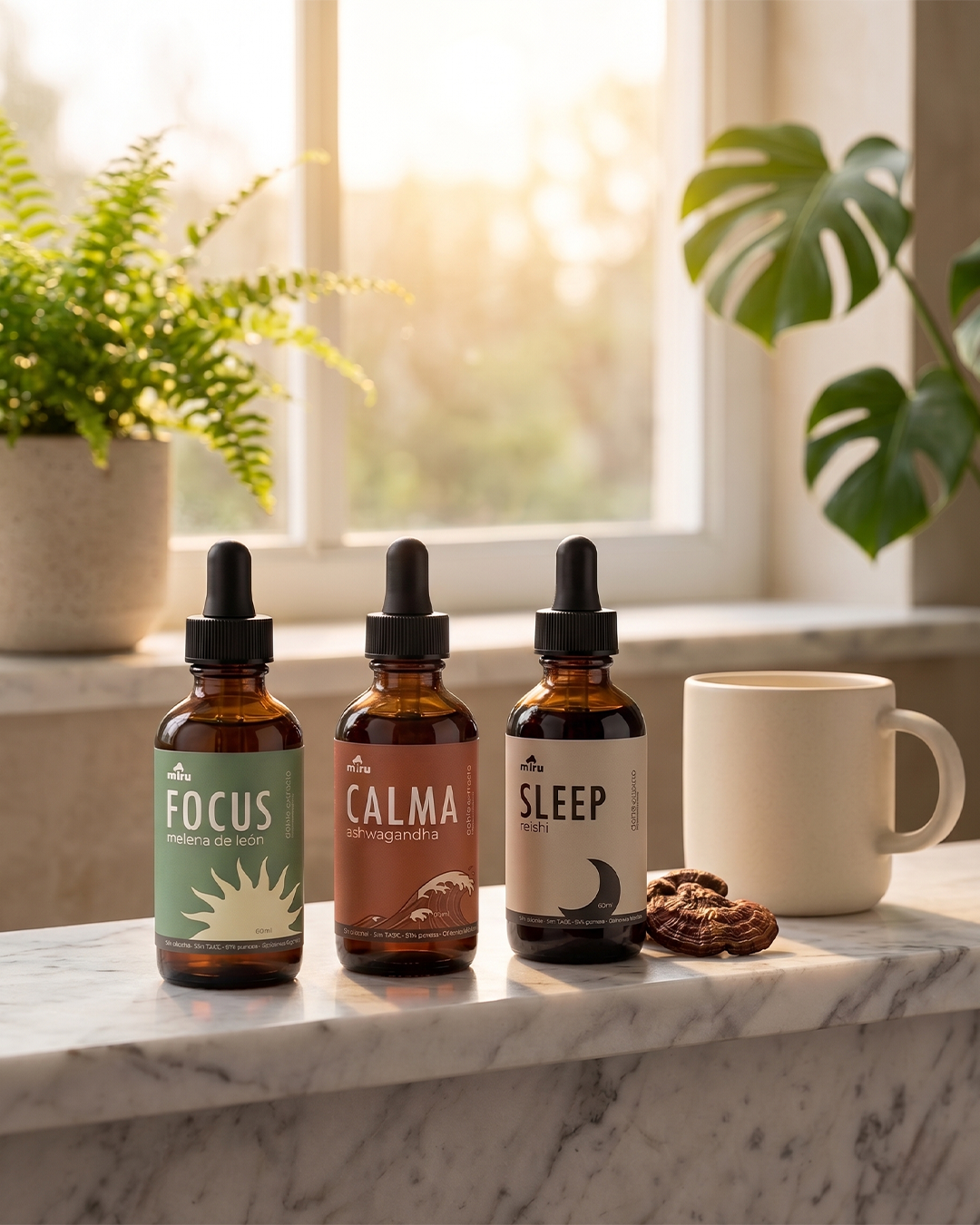 miru no utiliza alcohol en ninguna etapa del proceso de extracción. Mientras la mayoría de las tinturas del mercado usan bases hidroalcohólicas, nuestros extractos se elaboran exclusivamente con glicerina vegetal. El resultado: un extracto suave, sin ardor, sin sabor amargo y apto para quienes evitan el alcohol por salud, sensibilidad o elección personal.